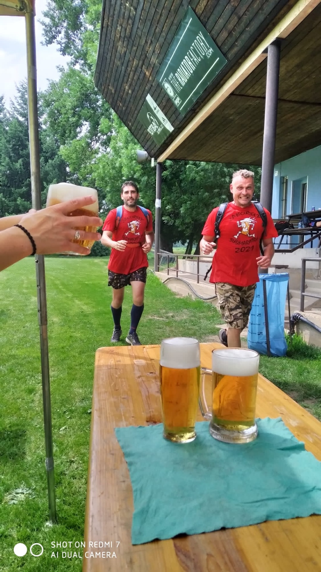 Zapomněl jsem napsat, že za druhým kilometrem prvního a třetího okruhu dodali takovou past v podobě spolupořadatelů, co mají různá lákadla, aby nás zdrželi. To místečko se nachází v půlce jediného kopečku široko daleko, takže jako vrchař v třetím kole vybíhám napřed a dávám si pár hltů jinačího lákadla, než mě Lukáš dožene Paní "Lakatošové" pak zřejmě na afterpárty oplácím stejnou mincí, zvu na panáka, což spustilo na baru řetězovou reakci (nebo se to připojilo k té probíhající) a ranní stav v peněžence by tomu odpovídal Po vyhrabání se z pískoviště třetího kola máme do cíle na posledním kilometru, pamatuji-li si to dobře, mezičas okolo dvou a čtvrt hodiny, do cíle rovinka a chybí nám pět pivek neboli jedno pětipivko. Dobíháme, dopíjíme, ale už nám to moc nejde. Z plánu na čas pod 2:30 se postupně stává plán na 2:31, pak 2:32.. Na 2:32:49 končíme, v traťovém rekordu, hned na první pokus, dosavadní rekord o víc než 20 minut překonán Při tom poprchávání a deštíku máme trika jak olověnou vestu. Ale stálo to za ten zážitek Fandíme dobíhajícím dalším týmům a tak, nálada tu panuje veskrze skrz na skrz pozitivní v intenzitě, jak my jsme promočení.